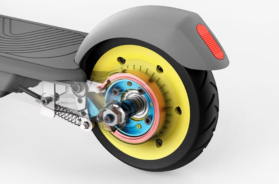 Ninebot KickScooter C10 оборудован ручным механическим тормозом со специальным датчиком, который отслеживает нажатия на рычаг и одновременно снижает подачу можности двигателя, для более эффективного торможения.