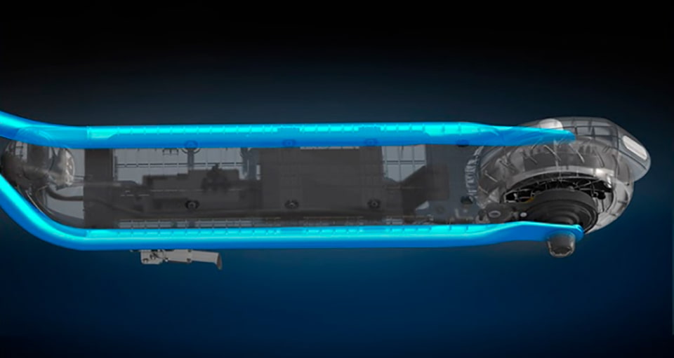 Рама электросамоката, сваренная из двух стальных труб, прошла множество различных тестов на прочность и выдерживает кратковременные перегрузки до 300 кг, а также пробег до 1000 км.